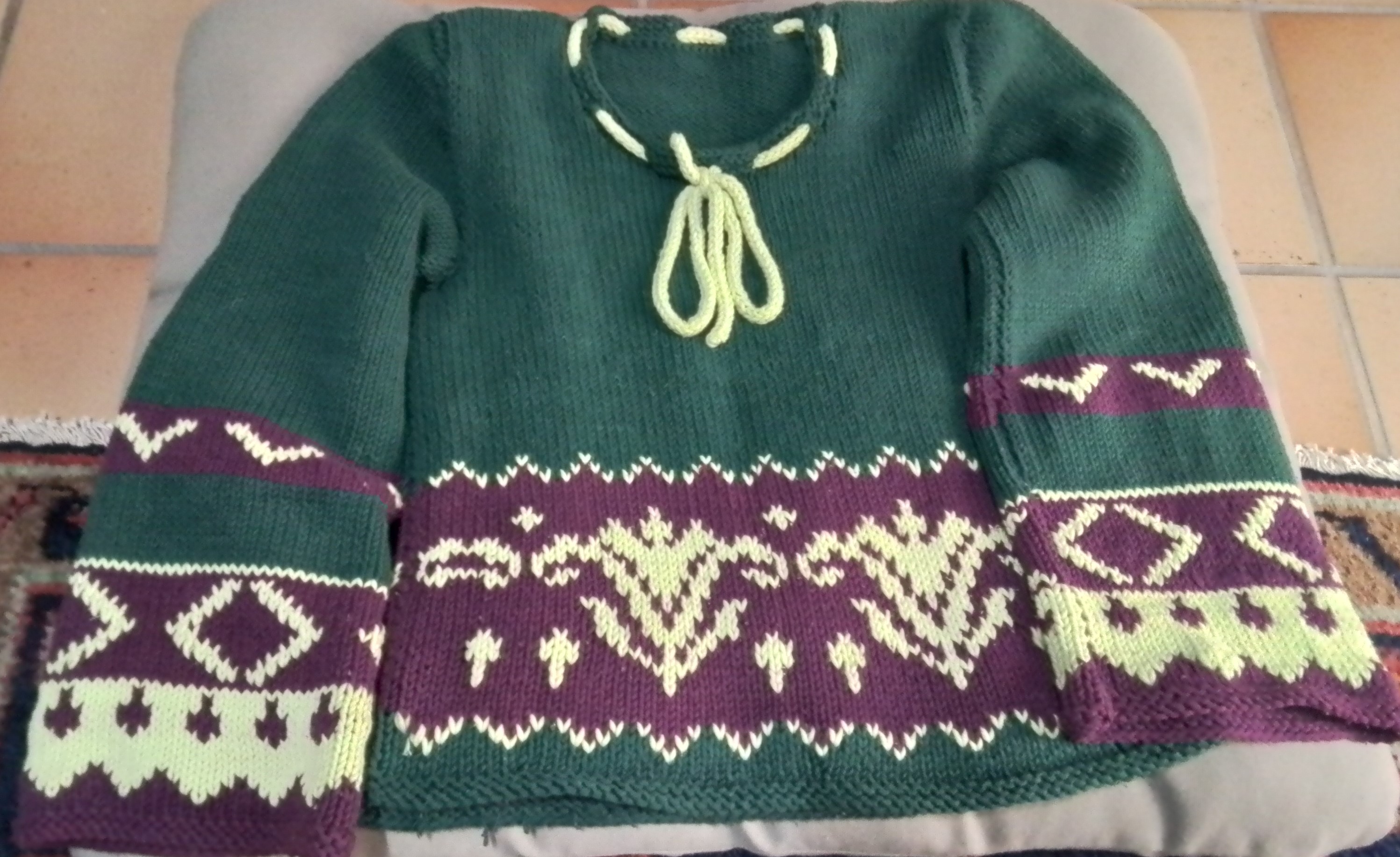 Einer der ersten Versuche mit Raglan-Ärmeln. Leider sind sie hier noch etwas kurz geworden. Darum gibt es extra Armstulpen dazu gegen kalte Hände.
