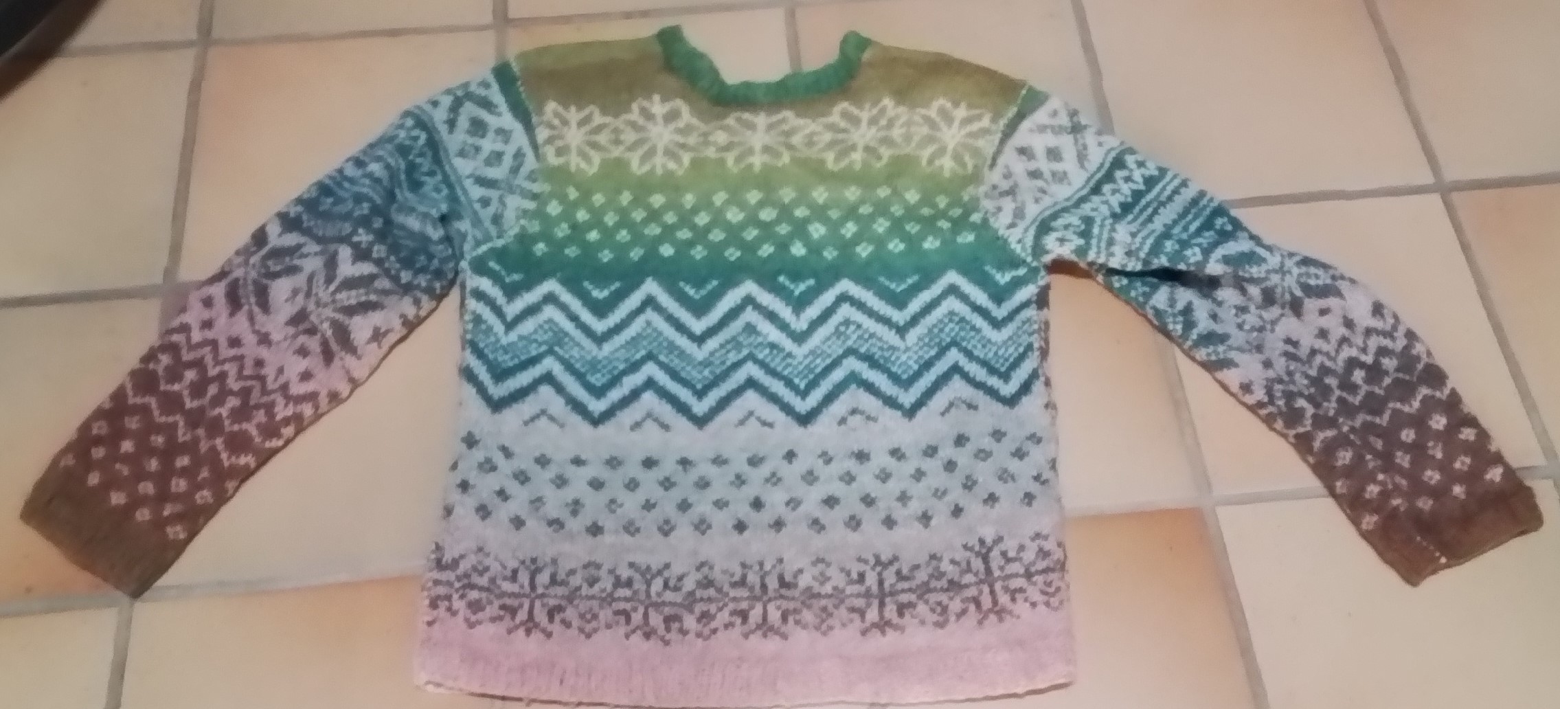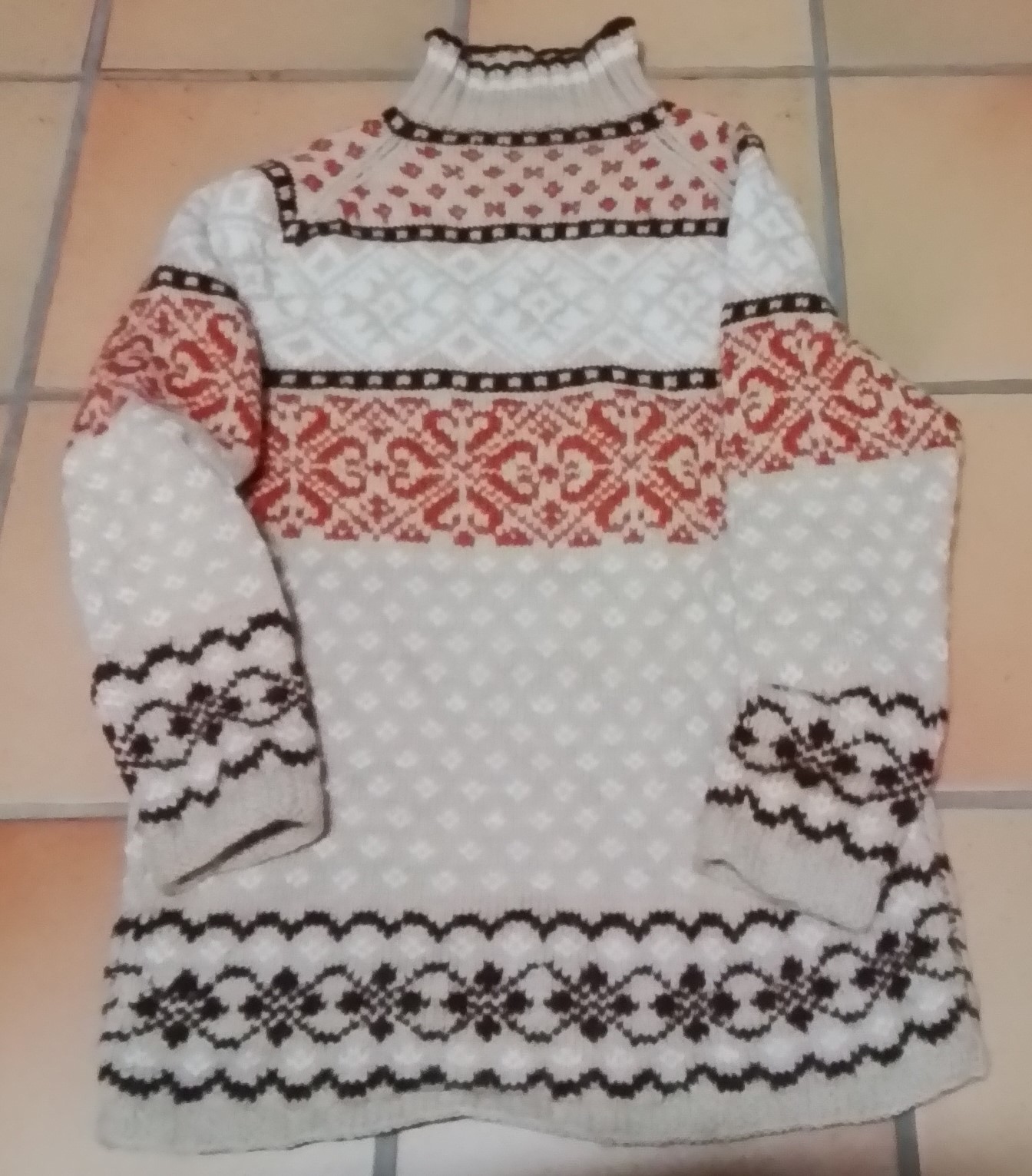 Gewünscht war eigentlich ein Norweger-Pulli, doch die ausgesuchte Wolle war zu fein und zu langhaarig für ein akurates Norweger-Muster. Darum diese schlichte Ausführung mit farbigen Streifen.
